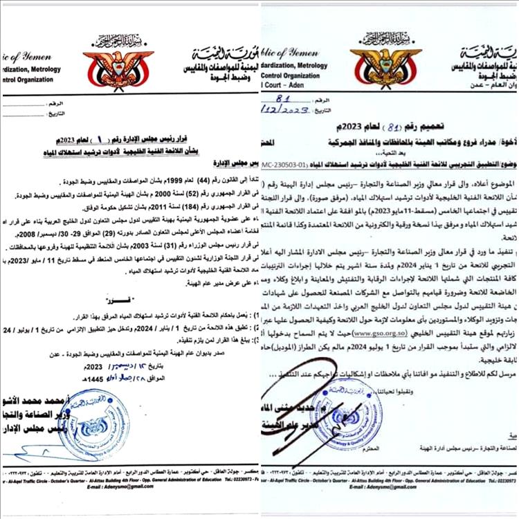 الجدير بالذكر صدور قرار معالي وزير الصناعة والتجارة رئيس مجلس إدارة الهيئة رقم (1) لسنة 2023م بشأن اعتماد اللائحة الفنية الخليجية لأدوات ترشيد استهلاك المياه حيث عممت الهيئة على كافة فروعها ومكاتبها في المحافظات والمنافذ الجمركية ومخاطبة الجهات ذات العلاقة بمقتضى القرار والمتضمن البدء بالتطبيق التجريبي للائحة من تاريخ 1 يناير 2024م ولمدة ستة أشهر يبدأ بعدها التطبيق الالزامي للائحة من تاريخ 1 يوليو 2024م.