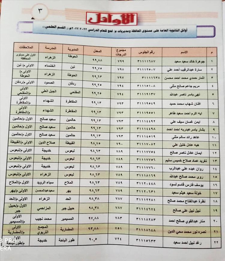 وأعلن مدير عام مكتب التربية والتعليم بالمحافظة فهمي بجاش هواش وإدارة الاختبارات بالمحافظة عن أسماء الطلاب الاوائل للثانوية العامة للعام الماضي وذلك في المطوية التي وزعت خلال حفل التكريم .