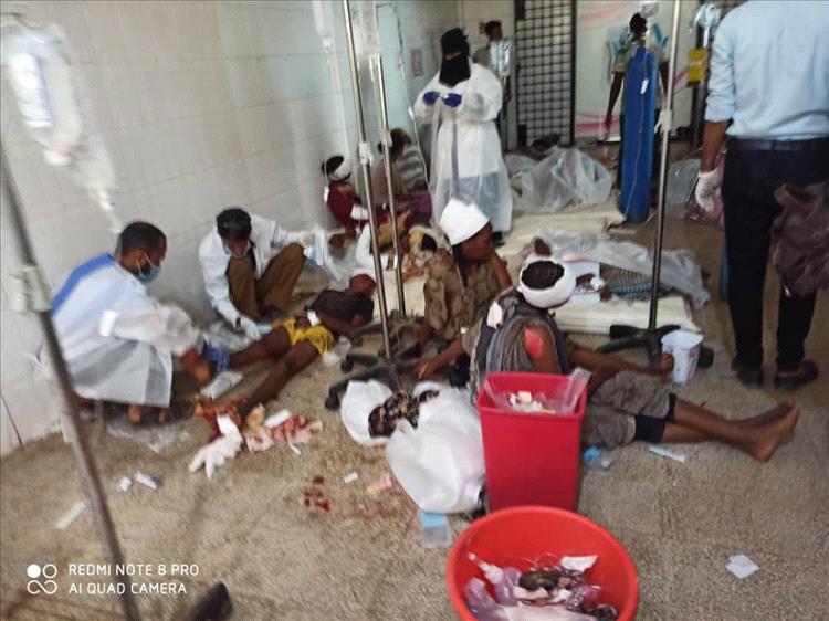 وشوهد الطاقم الطبي والتمريضي بقسم الحوادث بالمستشفى والعاملين بالهلال الأحمر اليمني فرع لحج وهم يقومون بالإسعافات الأولية للمصابين والذين تم نقل بعضهم إلى مستشفيات أخرى .