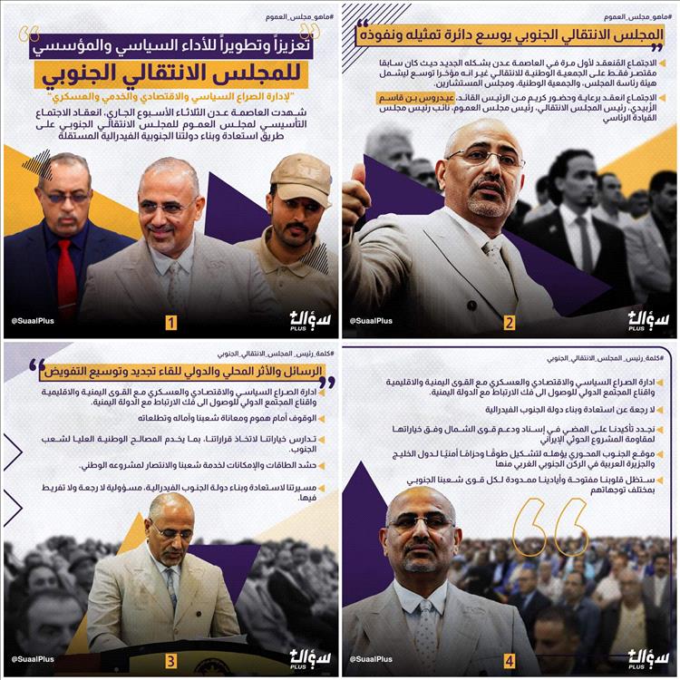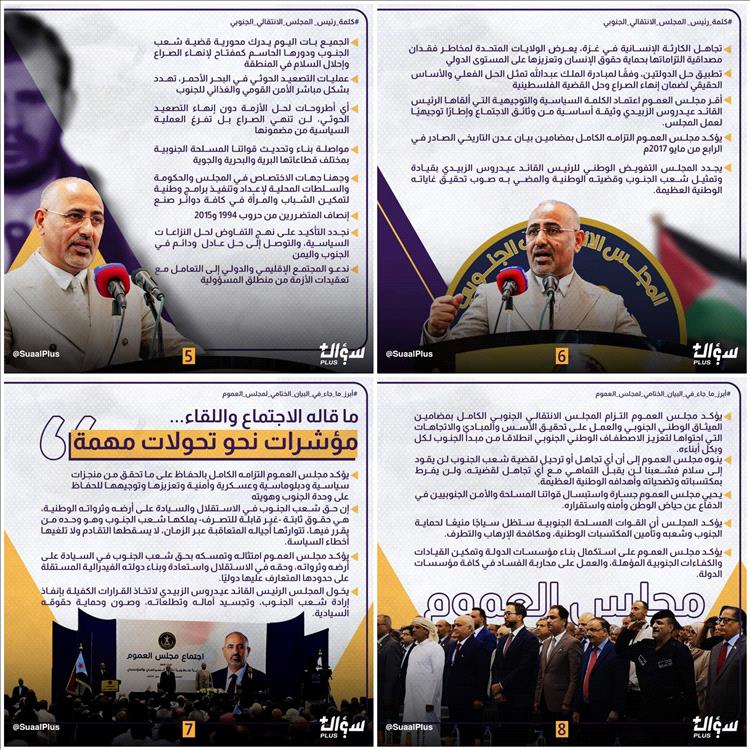 أبدت المنصة الإعلامية الجنوبية التي تديرها(سؤال بلس) اهتماما كبيرا بإنعقاد بإجتماعات مجلس العموم ونشرت المنصة تصاميم لوثائق المجلس بدءا بخطاب الرئيس عيدروس الزبيدي، رئيس المجلس الانتقالي الجنوبي مرورا بالبيان الختامي وانتهاء بالرسائل والأثر المحلي والدولي للقاء تجديد وتوسيع التفويض .