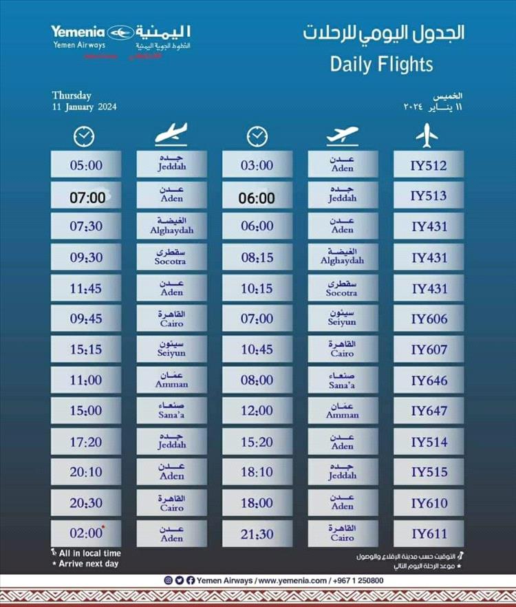 جدول مواعيد اقلاع رحلات طيران اليمنيه ليوم غد الخميس