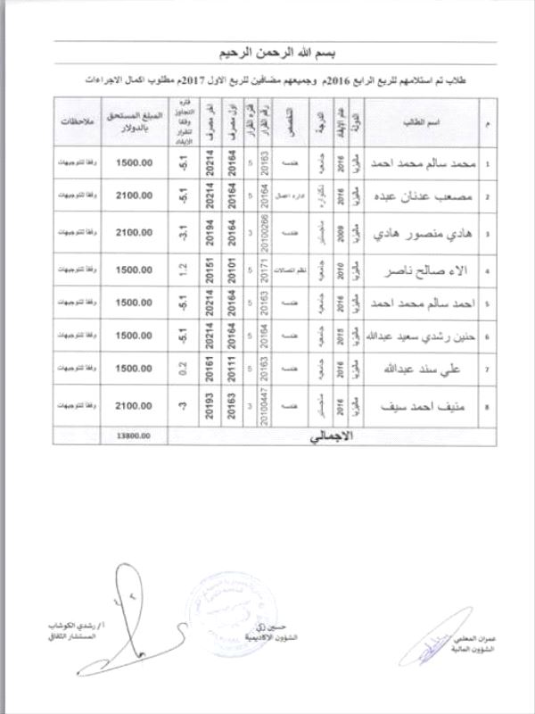ووفق مصادر خاصة فقد بلغت مستحقات الطلاب المضافين الـ 250 في كشوفات الدارسين بإجمالي 750الف دولار رسوم دراسية و 525 الف دولار مستحقات الربع الاول .