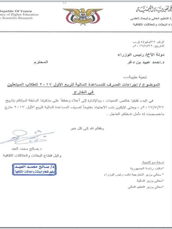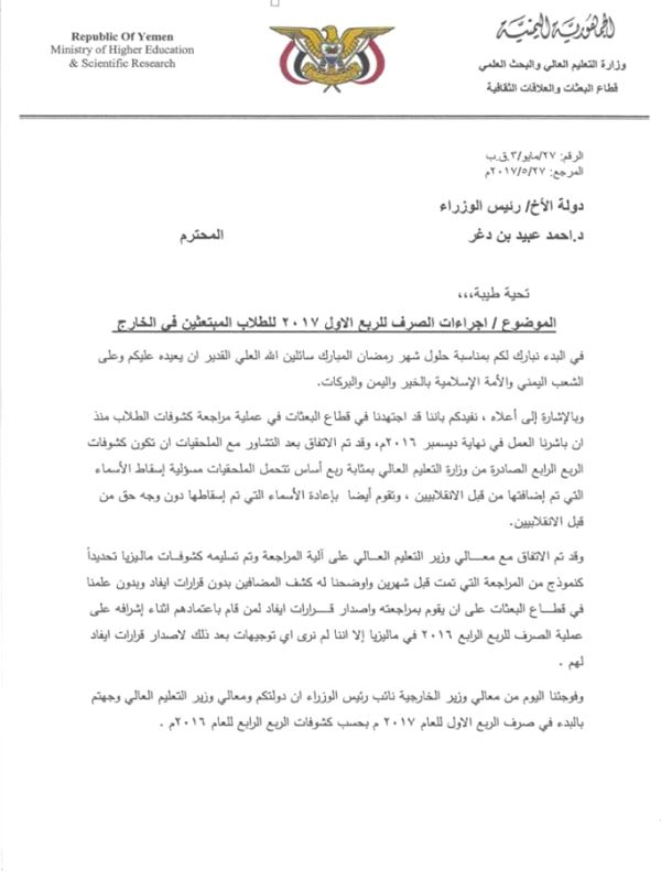 وحصل ( عدن تايم ) على مذكرة أخرى مرفوعة من وكيل وزارة التعليم العالي لقطاع البعثات الى رئيس الوزراء مكتوب عليها : (( عطفا على مذكرتنا السابقة لدولتكم بتاريخ 27 / 5 / 2017 ، وحتى لا يكون باب الاجتهاد مفتوحا لصرف المساعدة المالية للربع الاول 2017 خارج ما خصصت له نأمل تدخلكم العاجل )) .