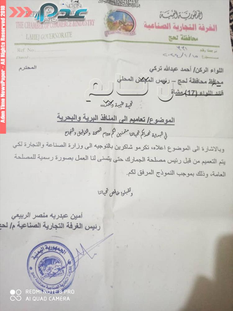 وثيقة.. تعميم بتغيير ختم الغرفة التجارية والصناعية بلحج
