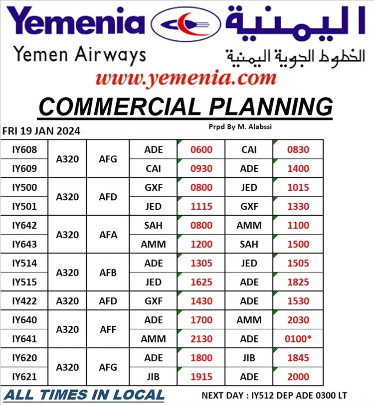 جدول مواعيد اقلاع رحلات طيران اليمنية ليوم غد الجمعة كالتالي: