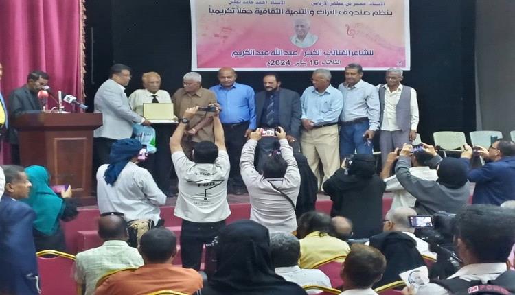 ما ميز الاحتفاء بالشاعر عبدالله عبدالكريم، تلك الألفة الفنية، التي أحاطت به من قبل الفنانين ومنهم الفنان الكبير محمد محسن عطروش والموسيقار احمد بن غوذل والفنانة أمل كعدل والفنان نجيب سعيد ثابت، الى جانب الاحتفاء به من شخصيات رسمية وجمهور ردد كلمات اغانيه، التي قدمها ثلاثة من الشباب، مع فرقة موسيقى محافظة عدن، في حين كان الفنان المسرحي فؤاد هويدي، وهو يقدم فقرات حفل التكريم، يضغط ويشد على الكلمات، محتفيا وتأكيدا على مكانة الشاعر.