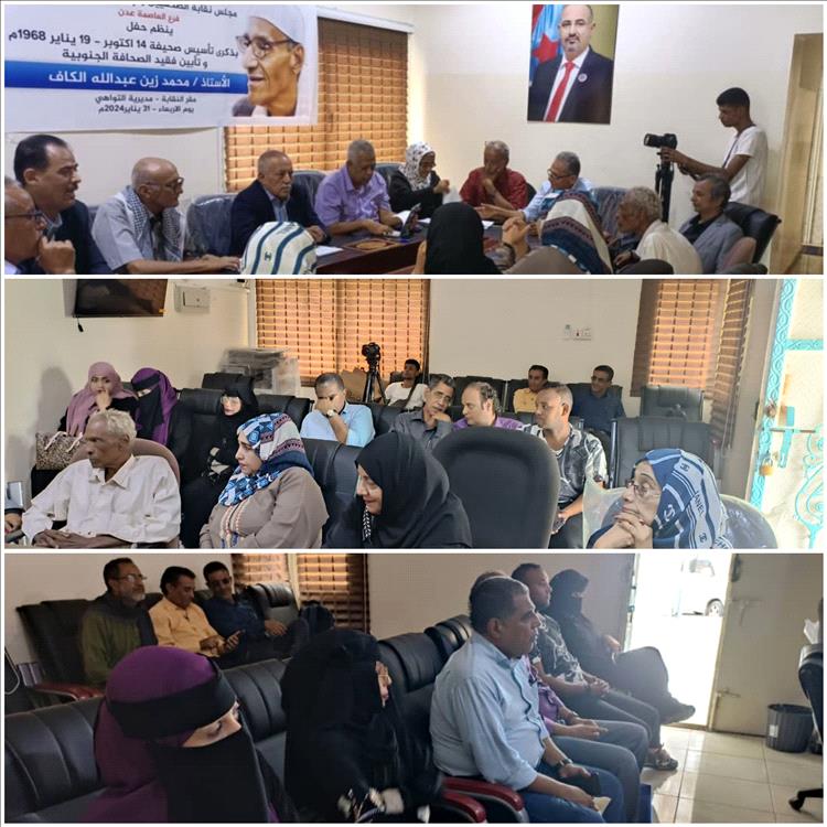 نظم مجلس نقابة الصحفيين والإعلاميين الجنوبيين فرع العاصمة عدن الأربعاء في مقر النقابة بمديرية التواهي فعالية بمناسبة ذكرى تأسيس صحيفة ١٤ أكتوبر ١٩ يناير ١٩٦٨م وتأبين فقيد الصحافة الجنوبية الأستاذ محمد زين عبدالله الكاف ، بحضور نخبة من الصحفيين والإعلاميين الجنوبيين ومشاركة رواد الصحافة الجنوبية ورؤساء تحرير صحيفة ١٤ اكتوبر في مراحل مختلفة منهم الزملاء نجيب صديق ، نادرة عبدالقدوس ، نجيب مقبل والصحفي عبدالقوي الاشول.