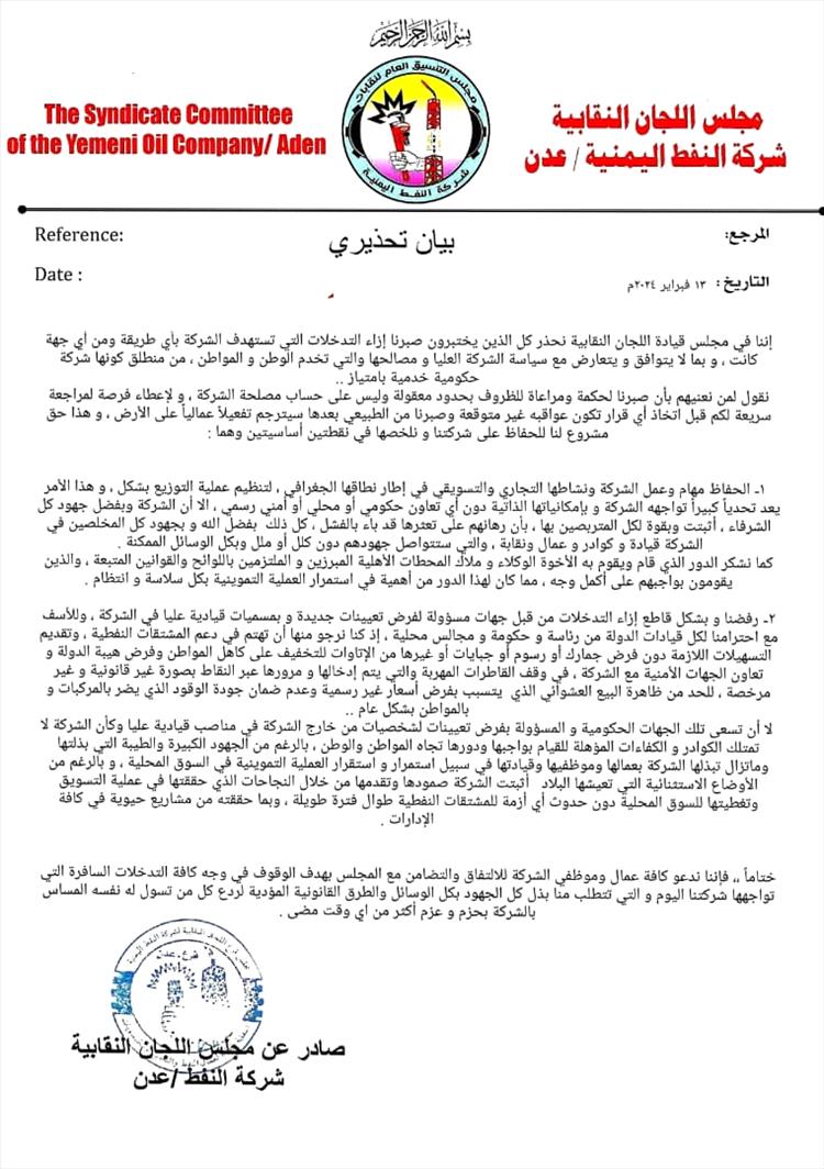 بيان تحذيري لمجلس اللجان النقابية لعمال وموظفي شركة النفط - عدن