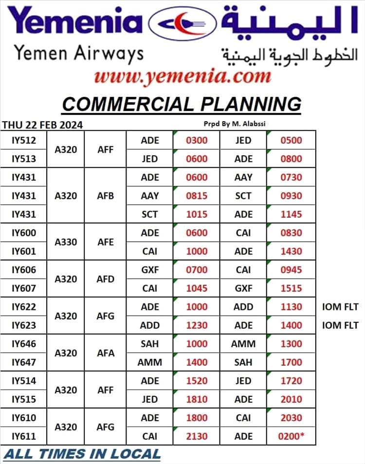 جدول مواعيد اقلاع رحلات طيران اليمنيه ليوم غد الخميس