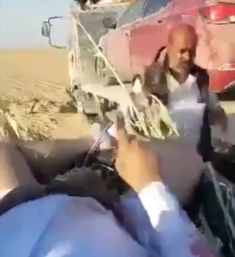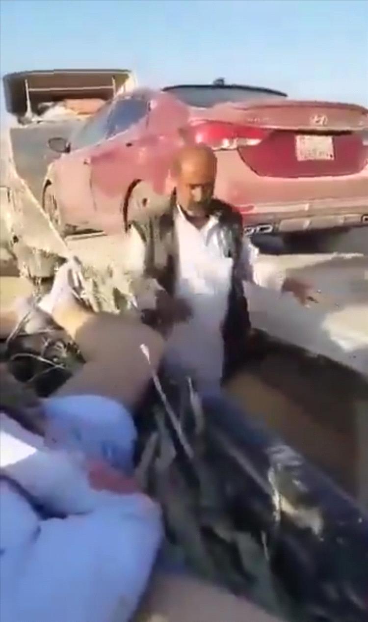 وارفق الناشطون مقطع فيديو للمغترب مرميا في الصحراء وزوجته وطفله حتى وصول فاعل خير من المارة وقام بنجدته.
