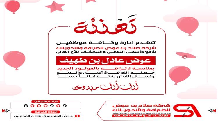 شركة صلاح بن عوض للصرافة والتحويلات بأرفع وأسمى التهاني والتبريكات للأخ الغالي