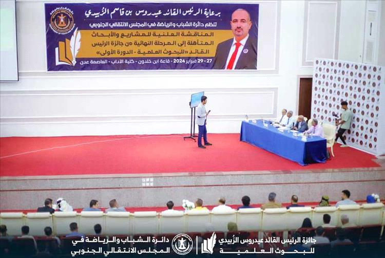 اختتمت دائرة الشباب والرياضة في المجلس الانتقالي الجنوبي، اليوم الخميس، المرحلة النهائية لجائزة الرئيس القائد عيدروس قاسم الزُبيدي للبحوث العلمية بالمناقشة العلنية لمشاريع الفئة الهندسية التي وصلت لنهائيات الجائزة.