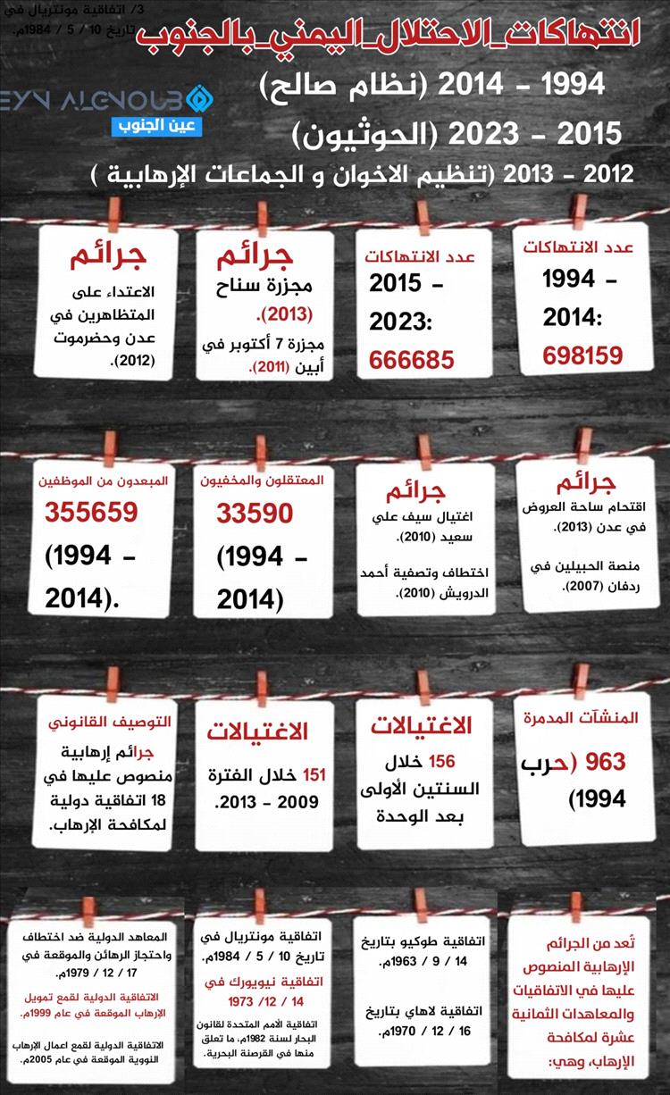 وتضمن التقرير رصد انتهاكات ميليشيات الحوثي بحق المدنيين في الجنوب خلال الفترة 2015-2023م، حيث اشار الى ان اجمالي تلك الانتهاكات التي حصلت عليها ووثقتها الشبكة (666685) حالة انتهاك راح ضحيتها (35649) قتيل ومصاب بينهم (1006) امرأة و(934) طفل، اضافة الى (3595) حالة اعتقال وتعذيب، بينهم (132) امراه (262) طفل، ونزوح مئات الالاف من المدنيين، وعدد (32443) اعتداء على الممتلكات العامة والخاصة والاعيان المدنية.