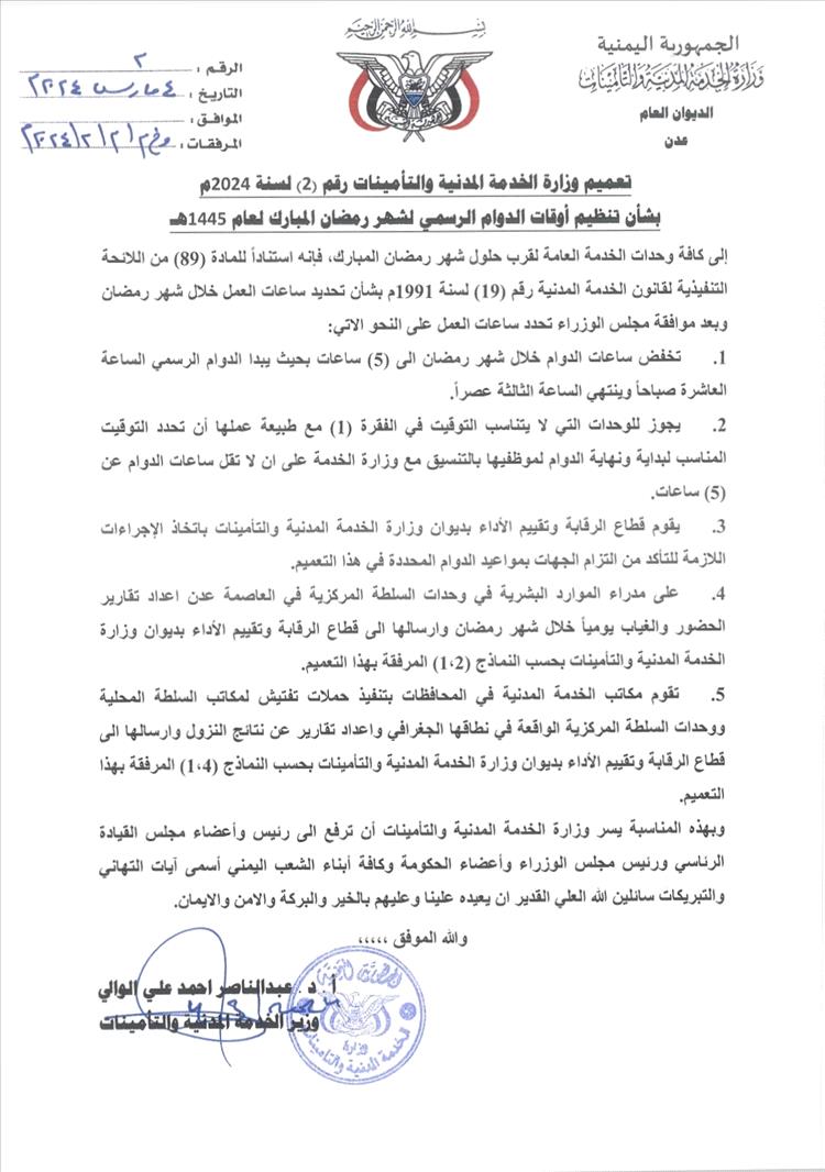 أصدرت وزارة الخدمة المدنية والتأمينات تعميماً رقم (2) لسنة 2024م بشأن تنظيم أوقات الدوام الرسمي لشهر رمضان المبارك العام 1445هـ.