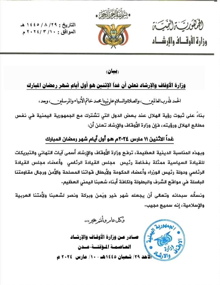 عاجل / اليمن تعلن غرة شهر رمضان (بيان)