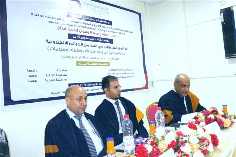 وأشادت لجنة المناقشة بالباحث وما بذله من جهود في رسالته التي استعرضها، والتي تهدف للحد من الجرائم الإلكترونية وتمحور نقاشها في تصويب الرسالة في إطارها النظري والتطبيقي.
