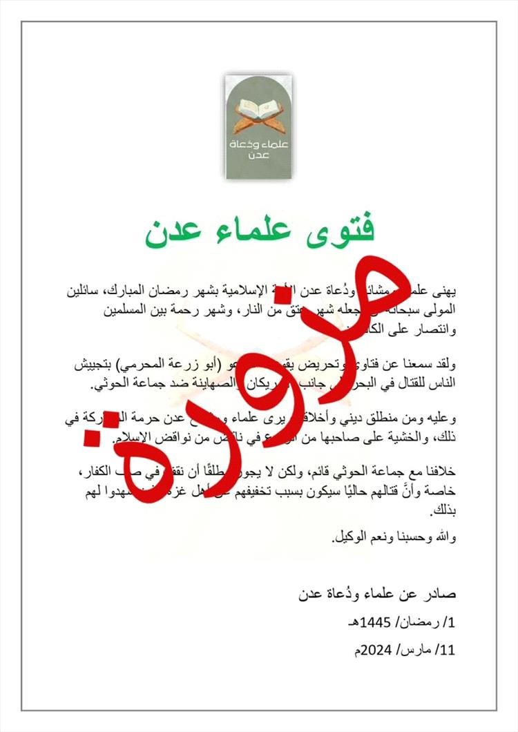 على وقع تحركات نائب رئيس مجلس القيادة الرئاسي أبو زرعة المحرمي ونشاطه اليومي ، وزعت مليشيات الحوثي فتوى انتحلوا فيها الشخصية الاعتبارية لعلماء ومشايخ ودعاة عدن ،زورا وبهتانا.