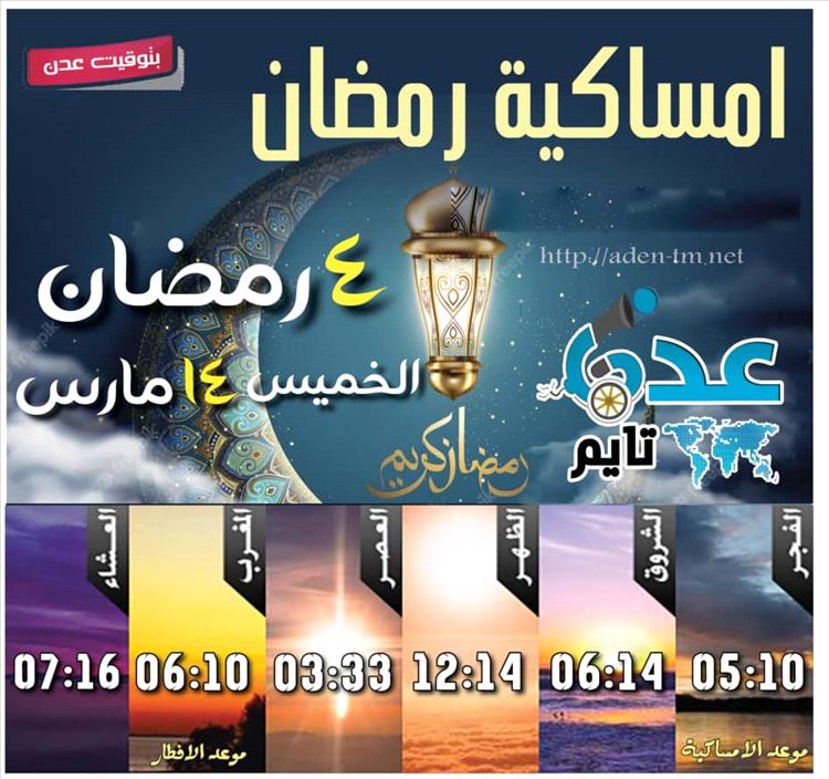 فيما يلي تنشر عدن تايم توقيت الامساكية والافطار وأوقات الصلاة في العاصمة عدن، وذلك في رابع أيام شهر رمضان المبارك الموافق الخميس 14 مارس 2024م.