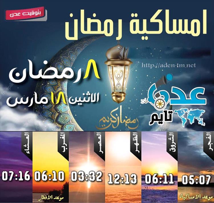 توقيت الإمساكية والافطار في العاصمة عدن يوم 8رمضان