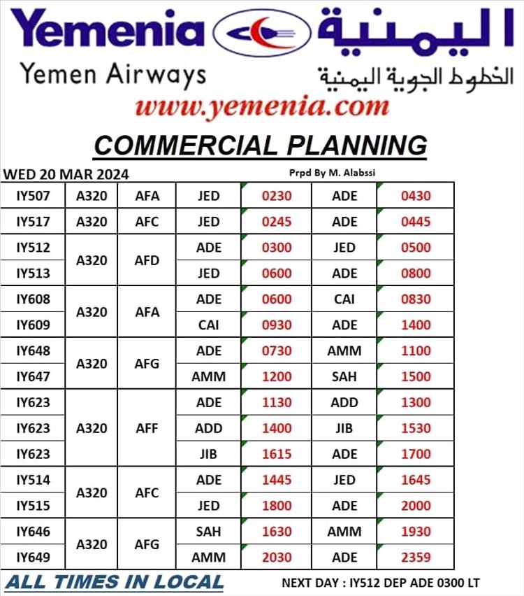 مواعيد اقلاع رحلات طيران اليمنية لليوم الاربعاء كالتالي: