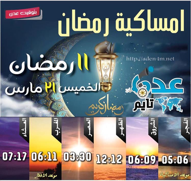 توقيت الإمساكية والافطار في العاصمة عدن يوم 11رمضان