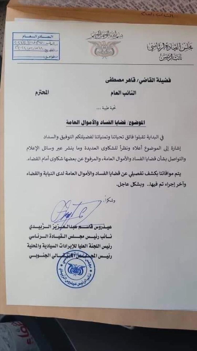 وأكد الزبيدي في المذكرة على الشكاوى المرفوع عن بعضها أمام القضاء، يتم موافاته بكشف تفصيلي عن قضايا الفساد والأموال العامة لدى النيابة والقضاء، وآخر إجراء تم فيها.. وبشكل عاجل .