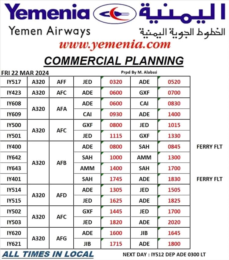مواعيد إقلاع رحلات طيران اليمنية ليوم غد الجمعة كالتالي: