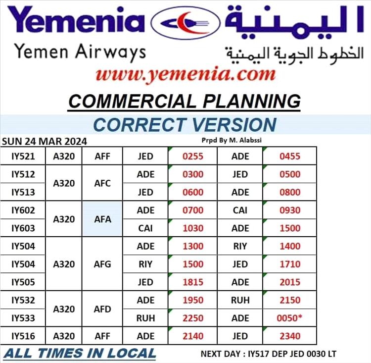 مواعيد اقلاع رحلات طيران اليمنية لليوم الاحد كالتالي: