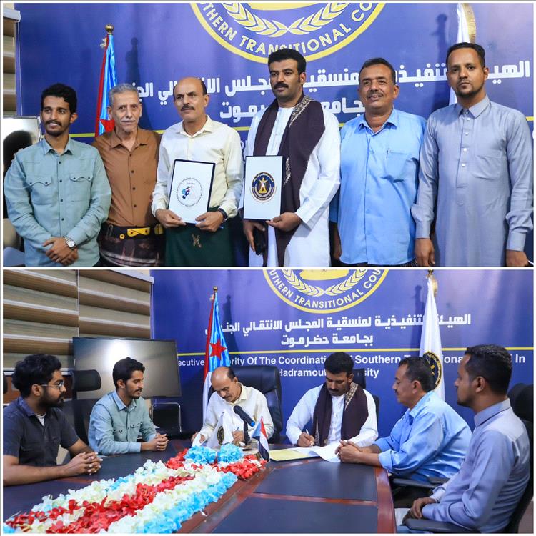 وقعت نقابة الصحفيين والإعلاميين الجنوبيين بحضرموت مذكرة تفاهم وتعاون مشتركة، مع منسقية المجلس الانتقالي الجنوبي بجامعة حضرموت.