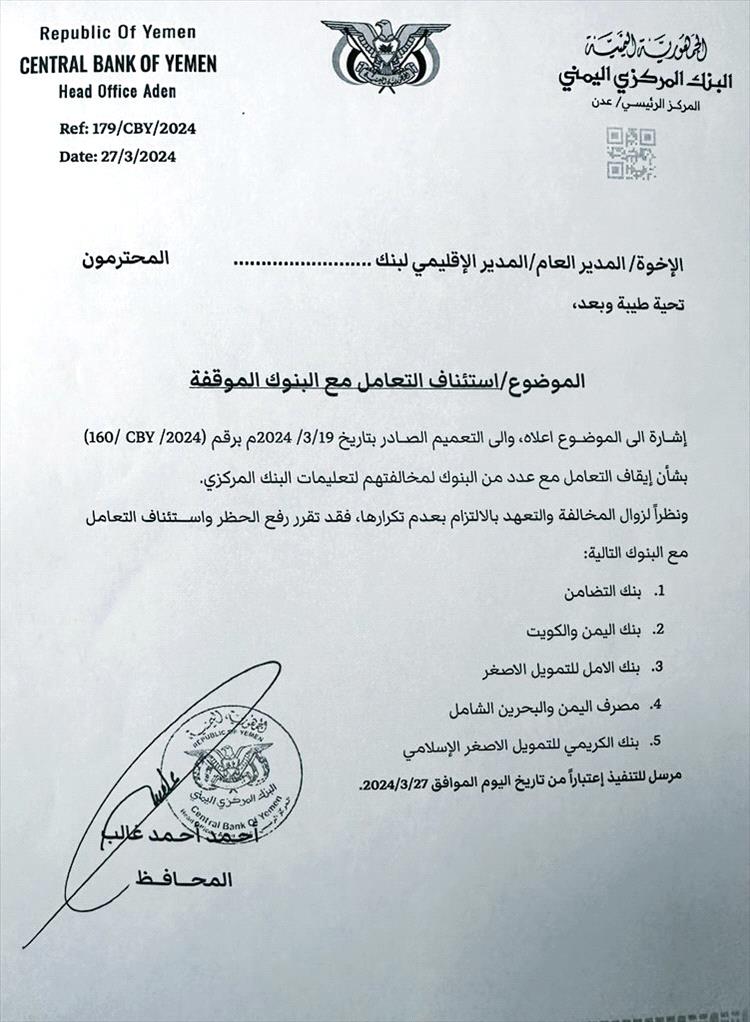 هذا ولم يؤكد البنك المركزي اليمني أو يوضح أو ينفي صحة تلك الوثيقة المتداولة..