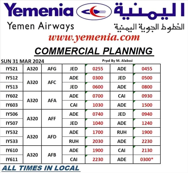 جدول مواعيد اقلاع رحلات طيران اليمنيه ليوم غد الاحد