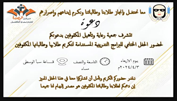 في إطار المشاركة الفعالة ، وبدعوة كريمة من جمعية رعاية وتأهيل المكفوفين م / عدن ، وبالتعاون مع مركز البصيرة للتأهيل والتدريب التابع لجمعية المكفوفين ينظمان حفل ختامي للبرامج التدريبية المستدامة لتكريم طلابها وطالباتها.