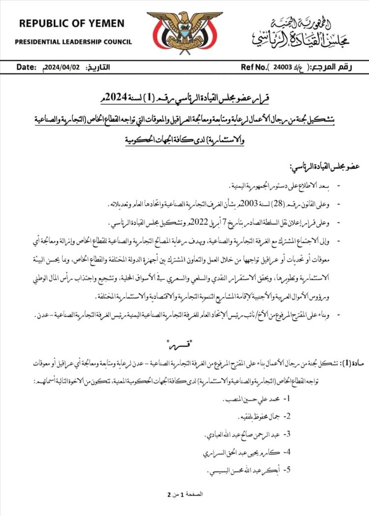 أصدر عضو مجلس القيادة الرئاسي "أبو زرعة المحرّمي"، القرار رقم (1) لسنة 2024م، بشأن تشكيل لجنة من رجال الأعمال لرعاية ومتابعة ومعالجة العراقيل والمعوقات التي تواجه القطاع الخاص (الصناعية والتجارية والاستثمارية) لدى كافة الجهات الحكومية المعنية.