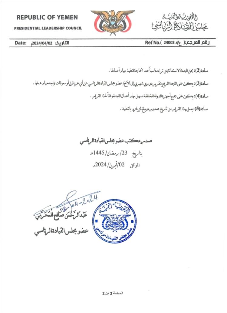كما كُلفت اللجنة برفع تقريرها الدوري الشهري لعضو مجلس القيادة الرئاسي "المحرمي"، عن أي عراقيل تواجه مهام عملها، وعلى أجهزة الدولة تسهيل مهام عمل اللجنة وفقاً لهذا القرار.