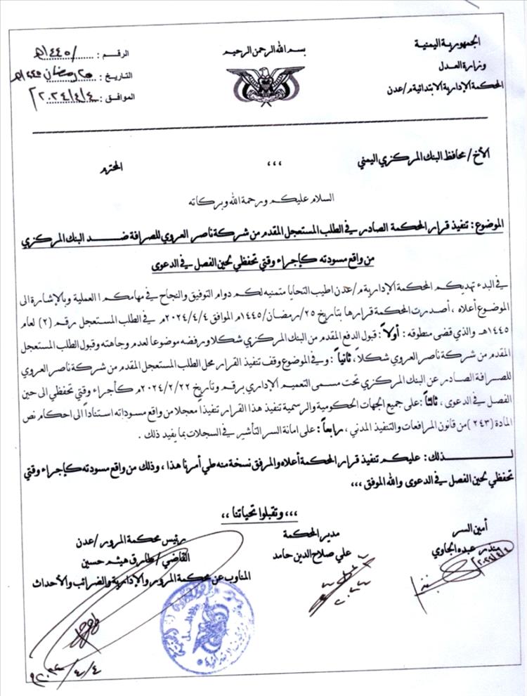 وجاء في قرار المحكمة : اولا قبول الدفع المقدم من البنك المركزي شكلا ورفضه موضوعا لعدم وجاهته ، وقبول الطلب المستعجل المقدم من شركة ناصر العروي شكلا ، ثانيا وفي الموضوع وقف تنفيذ القرار محل الطلب المستعجل المقدم من شركة ناصر العروي للصرافة الصادر عن البنك المركزي تحت مسمى التعميم الاداري بتاريخ ٢٢ فبراير ٢٠٢٤م كاجراء وقتي الى حين الفصل في الدعوى. ثالثا على جميع الجهات الحكومية والرسمية تنفيذ القرار تنفيذ معجلا.