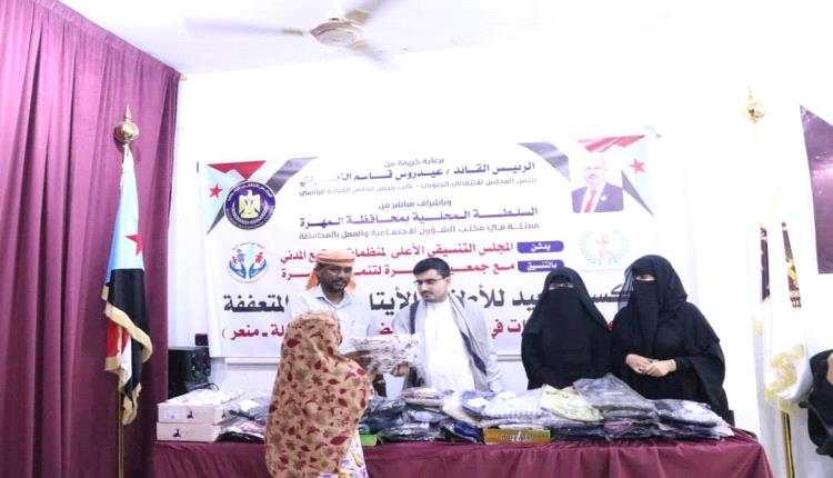 دشن رئيس الهيئة التنفيذية للقيادة المحلية للمجلس الإنتقالي الجنوبي ، مجاهد أبوشوارب عيسى بن عفرار عصر اليوم بالعاصمة الغيضة، مشروع توزيع كسوة العيد للأيتام والأسر المتعففة والتي تنفذه جمعية المهرة لتنمية المرأة برعاية كريمة من الرئيس القائد عيدورس بن قاسم الزبيدي رئيس المجلس الإنتقالي الجنوبي.