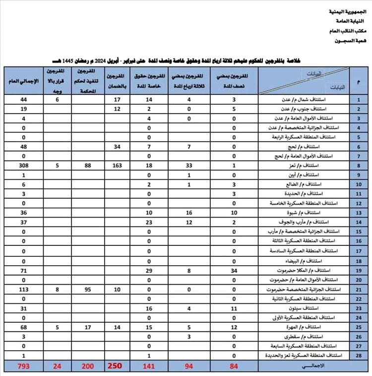 وقد قامت شعبة السجون في مكتب النائب ممثله برئيسها الدكتور ناصر الصبيحي وطاقم الشعبة بالنزول والمتابعة لكافة النيابات في المحافظات المحررة وزيارة الاصلاحيات المركزيه للوقوف على تنفيذ التعميم المشار إليه أعلاه، وبمتابعة مستمره من قبل معالي النائب العام والمحامي العام الأول، كُلل خلاصة ذلك الجهد في الإفراج على عدد 793 من المحكومين، حيث شمل الإفراج على 84 مفرج بمضي نصف المدة، و 94 مفرج بمضي ثلاثة أرباع المدة، و 141 مفرج حقوق خاصة، 250 مفرج بالضمان، 200 مفرج تنفيد لحكم المحكمة، 24 مفرج قرار بالا وجه وذلك وفقاً للكشف الصادر من شعبة السجون الخاص بالمفرجين حتى يومنا هذا الثلاثاء تاريخ 4/9/ 2024م الموافق ٣٠ رمضان ١٤٤٥هـ.