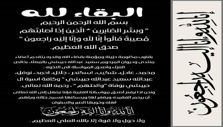 بقلوب مكلومة حزينة ومؤمنة بقضاء الله وقدره يتقدم أعضاء منتدى وديوان المرحوم سعيد عبدالله حبيشي بالمعلا، بخالص العزاء وأصدق المواساة الى الاخوه "محمد، عادل، شكيب، اسكندر، جلال، احمد، نوفل، عبدالله سعيد عبدالله حبيشي " وكافة اسرة ال حبيشي بوفاة "والدتهم " ، رحمه الله تعالى.
