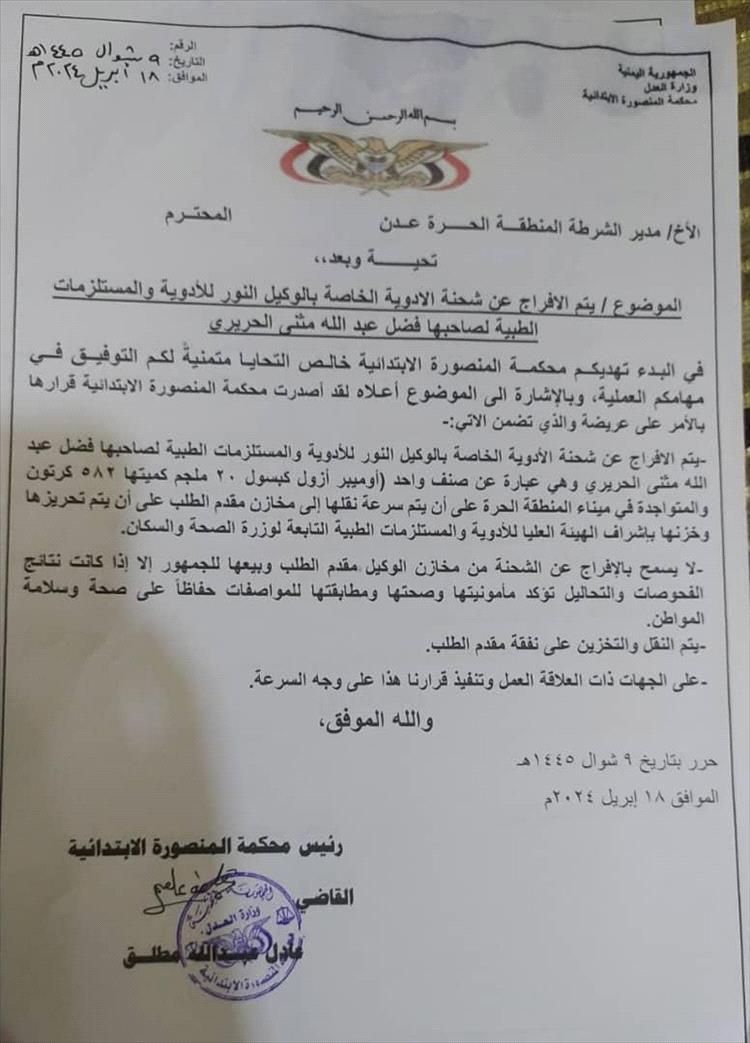 الأمر القضائي بالإفراج عن الحاوية أصدرته محكمة المنصورة الابتدائية، مساء الخميس 18 أبريل، ووجهت بموجبه شرطة المنطقة الحرة - عدن، بالإفراج الفوري عن الحاوية التي يملكها أحد أكبر تجار الأدوية، دون التأكد من جودة وصلاحية الأدوية، إذ وجهت المحكمة بفحص محتويات الحاوية بعد الإفراج عنها.