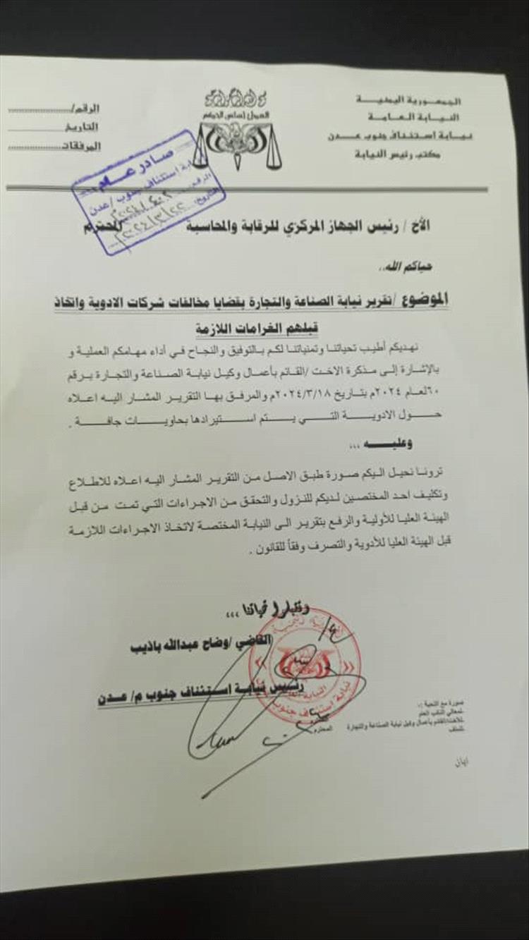 وناشد المختصون، مجلس القيادة الرئاسي ورئاسة الحكومة، بعدم السماح بتجاوز قرار تعميم نيابة استئناف جنوب عدن برئاسة القاضي وضاح باذيب، بناءاً على تقرير نيابة الصناعة والتجارة، بعدم إدخال أي حاوية أدوية مخالفة لمتطلبات وظروف الخزن، والتدخل العاجل لحماية المستهلك والمرضى، حتى لا يتحول الدواء إلى داء.