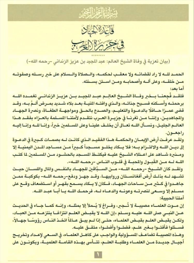 نعى تنظيم القاعدة الإرهابي في جزيرة العرب زعيم جماعة الأخوان المثير للجدل " عبد المجيد الزنداني " ووصفه بالعالم وان موته فاجعة واضاف في بيان متداول إن الزنداني قضى عمرة حاملا للدعوة والجهاد وقول الحق في وجه الطغاه داعيا أن يخلف لهم خيرا منه وهو اعتراف صريح با نتماءه للتنظيم قي الجزيرة العربية