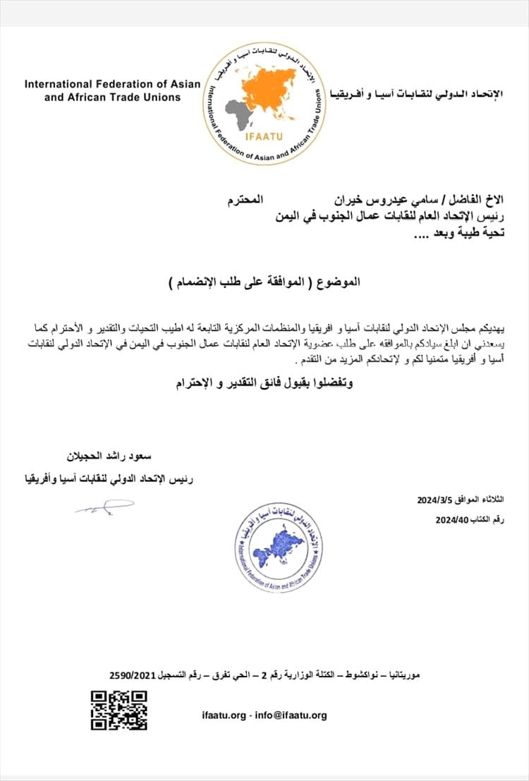 يهديكم مجلس الاتحاد الدولي لنقابات اسيا وأفريقيا والمنظمات المركزية التابعة له اطيب التحايا والتقدير والاحترام ، كما يسعدني أن أبلغ سيادتكم بالموافقة على طلب عضوية الاتحاد العام لنقابات عمال الجنوب في اليمن في الاتحاد الدولي لنقابات اسيا وأفريقيا متمنيا لكم ولاتحادكم المزيد من التقدم .