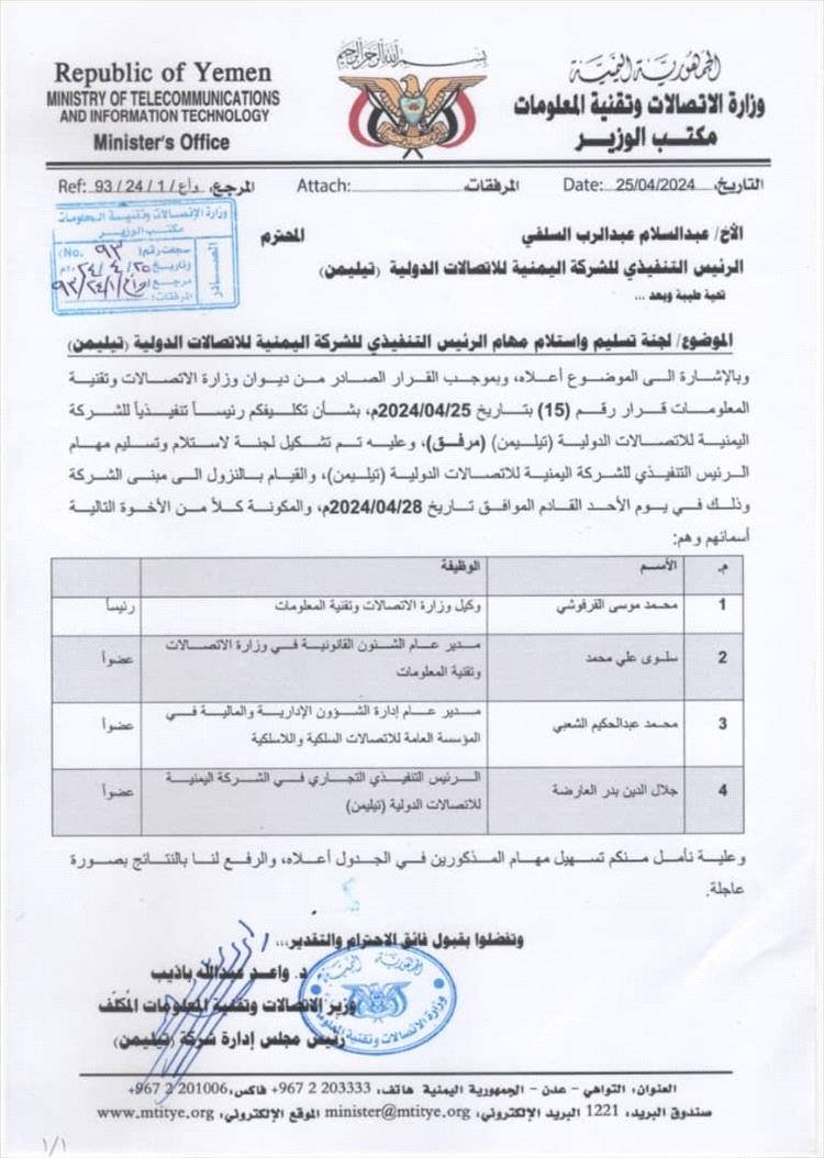 وفي ذات السياق أصدر الوزير د. باذيب تعميم بشأن تشكيل لجنة تسلم واستلام مهام الرئيس التنفيذي لشركة "تيليمن".