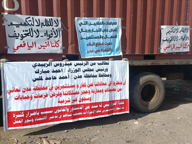 وعبر التجار عن تضامنهم مع زميلهم التاجر أنيس اليافعي الذي احتجزته نيابة البحث، ورفعوا صوره ولافتات تضامنيه كتب عليها "كلنا أنيس اليافعي".