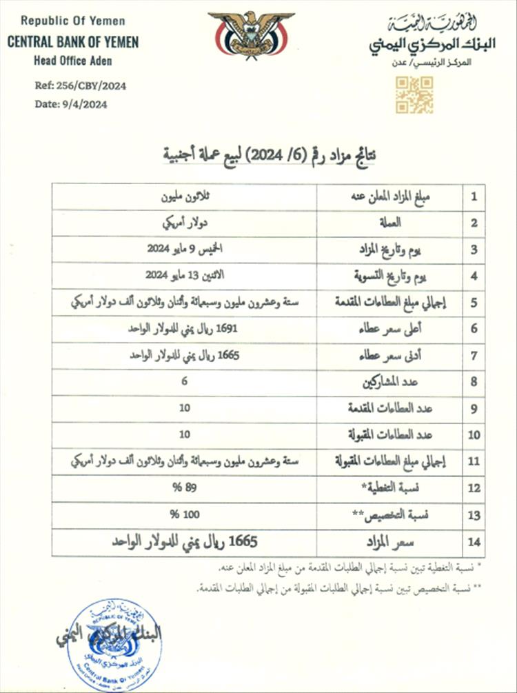 أعلن البنك المركزي اليمني اليوم الخميس على موقعه بالأنترنت وتابعه عدن تايم نتائج المزاد رقم (6-2024) لبيع عملة أجنبية، والتي أعلن عنها يوم الأحد الماضي.