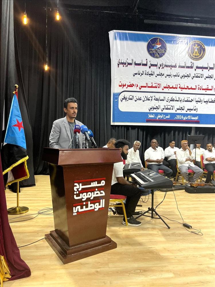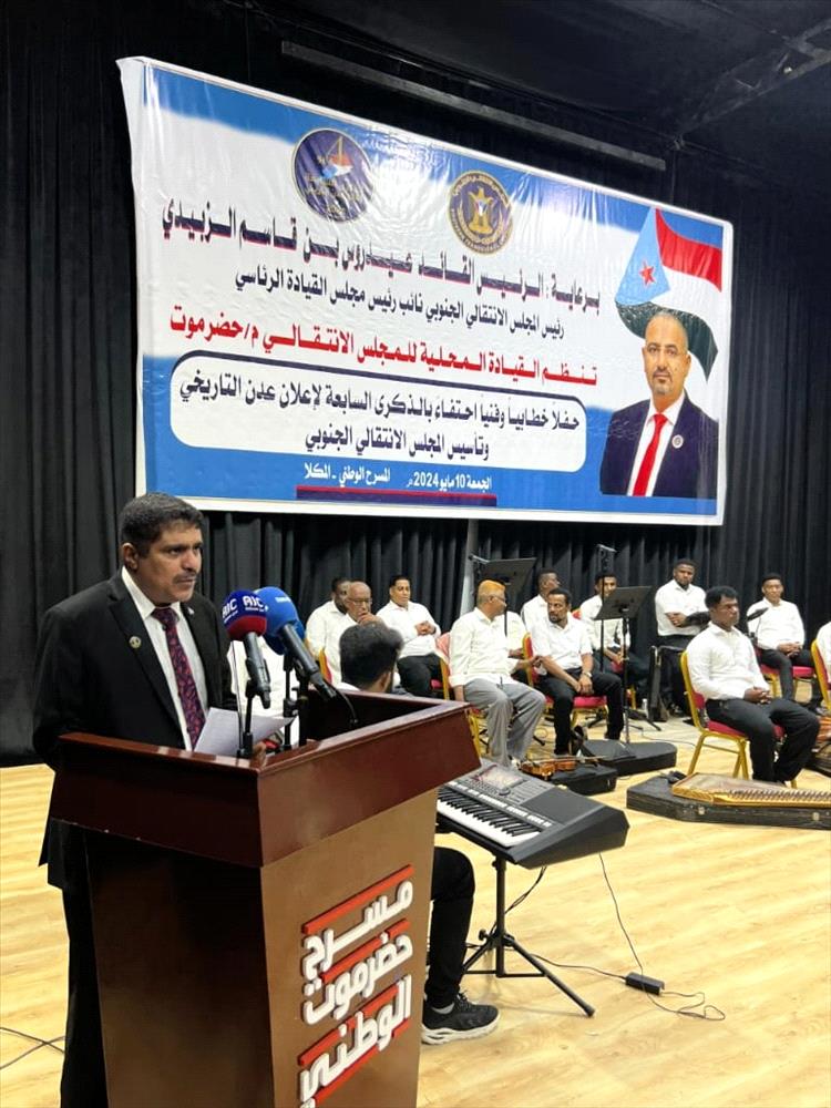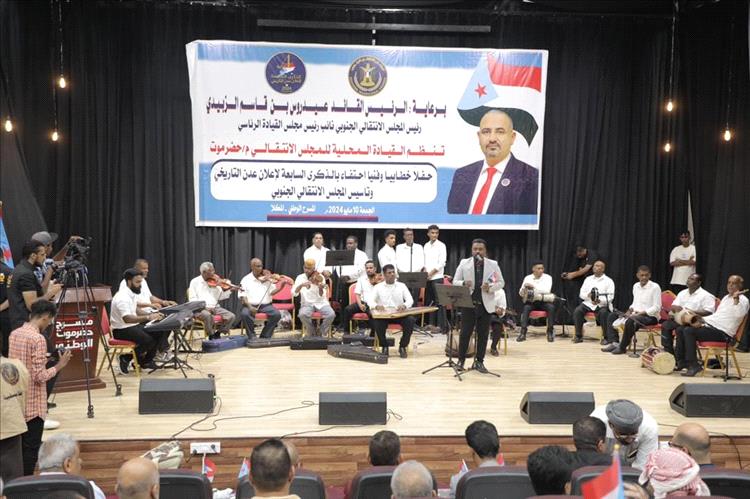 نظمت القيادة المحلية للمجلس الانتقالي الجنوبي بمحافظة حضرموت، مساء الجمعة، بمدينة المكلا، حفلاً خطابياً وفنياً بمناسبة الذكرى السابعة لإعلان عدن التاريخي وذكرى تأسيس المجلس الانتقالي الجنوبي، برعاية الرئيس القائد عيدروس قاسم الزُبيدي، رئيس المجلس الانتقالي الجنوبي نائب رئيس مجلس القيادة الرئاسي.