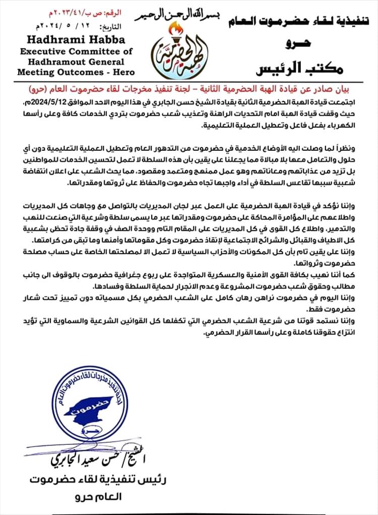 بيان صادر عن قيادة الهبة الحضرمية الثانية - لجنة لقاء مخرجات حضرموت العام "حرو"