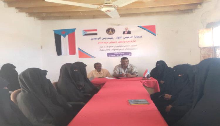 نظمت إدارة والمرأة والطفل بالهيئة التنفيذية للقيادة المحلية للمجلس الانتقالي الجنوبي بمديرية بروم ميفع ،اليوم الثلاثاء لقاءا تشاوريا مع الناشطات السياسيات بالمديرية .