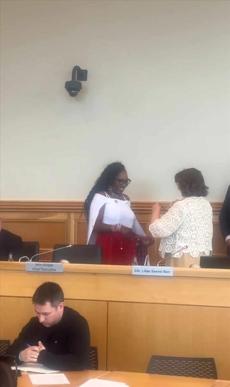 وتجمع حشد من حوالي 300 شخص داخل قاعة جيلدهول لمشاهدة السيدة سينوي بار وهي تتسلم منصب رئاسة البلدية.