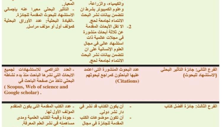 ٥- ألا تكون الابحاث المقدمة للحصول على الجائزة قد سبق لها الحصول على أي جوائز أو ترقية للألقاب العلمية.